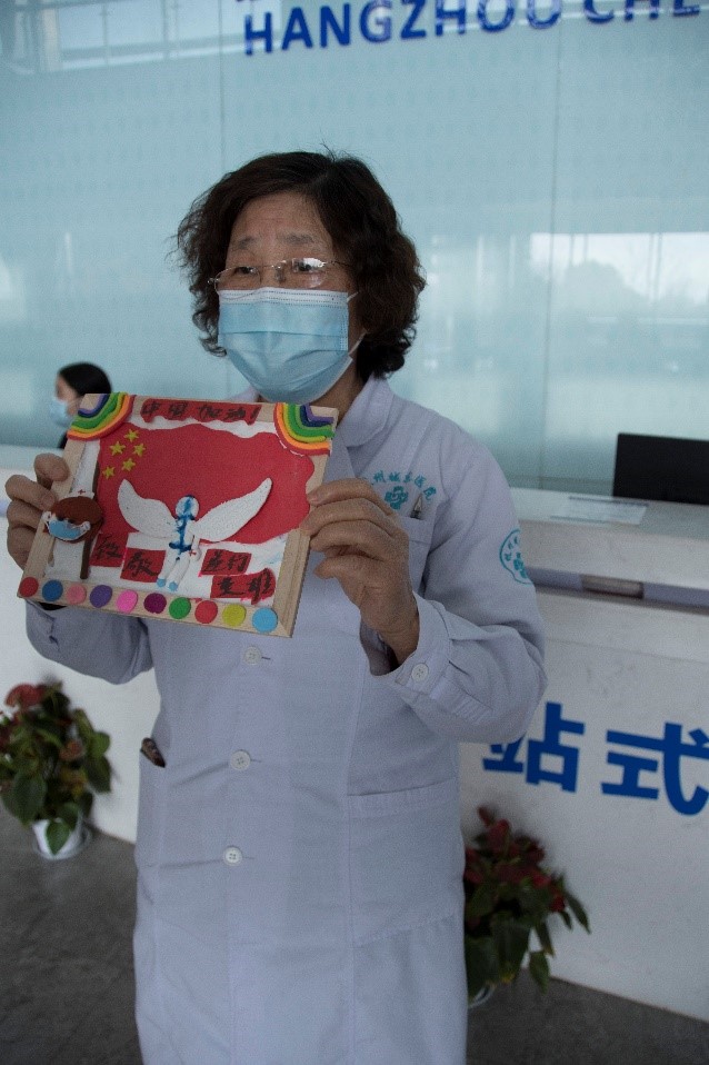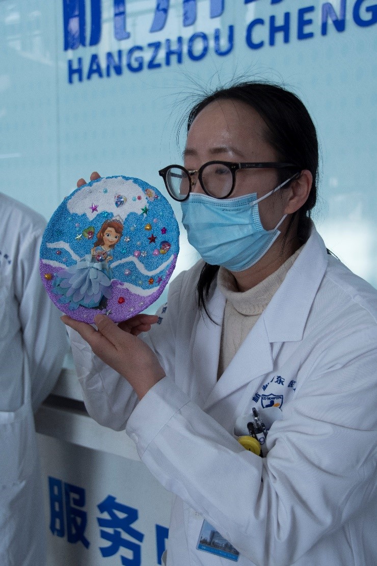 | 内科(神经)主任高焕民展示小朋友的工艺画《中国加油》 | 内科(神经)主治医师黄月虹展示小朋友的工艺画《索菲亚公主》 |